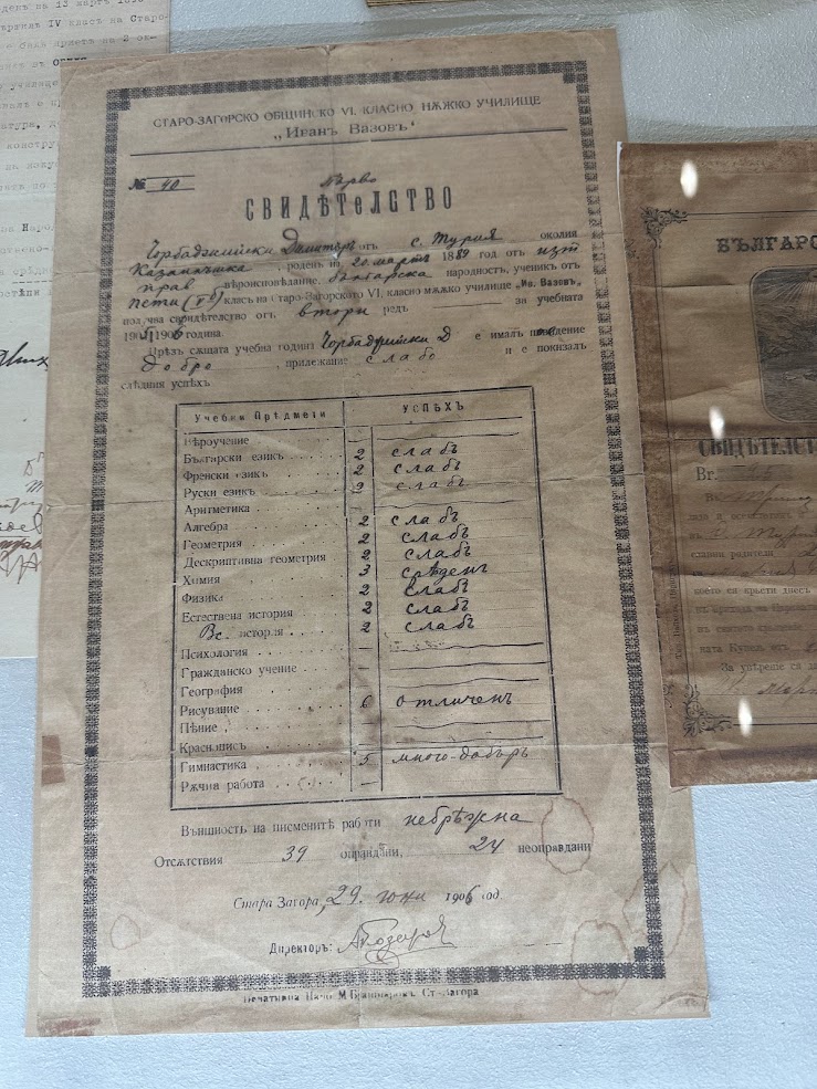 Първата ни спирка е витрината, където е изложено свидетелството му за завършен пети клас в село Турия. От горе до долу само двойки и единствено по рисуване и гимнастика съответно отличенъ и много добъръ. Използвам свидетелството му за предметно поучение, когато истерични приятелки ми се оплакват, че децата им не четат достатъчно. Ето, казвам им, светът не е произлязъл от отличниците. И другото, което им казвам – правете деца, бе! Чудомир е седмото от осем, Бах бил осмото, Моцарт – седмото. Постигането на съвършенство изисква труд и многократни опити. Ама те моите дружки до една начетени и много умни. Не можеш току тъй ги излъга. Леонардо да Винчи и Леонардо ди Каприо, викат ми, са единствени деца, пък им се е получило. Ей, надприказване нямат тези кикимори!