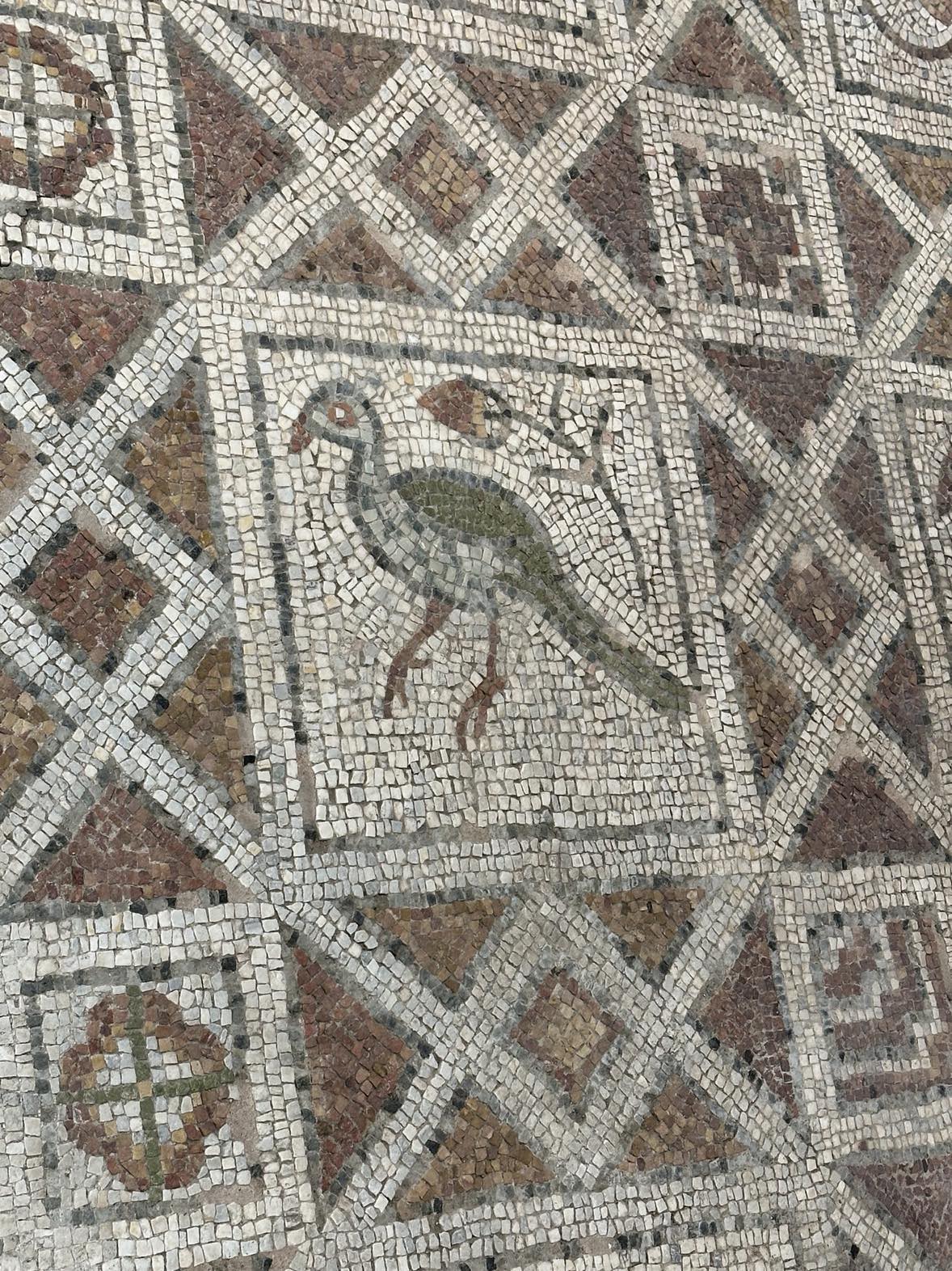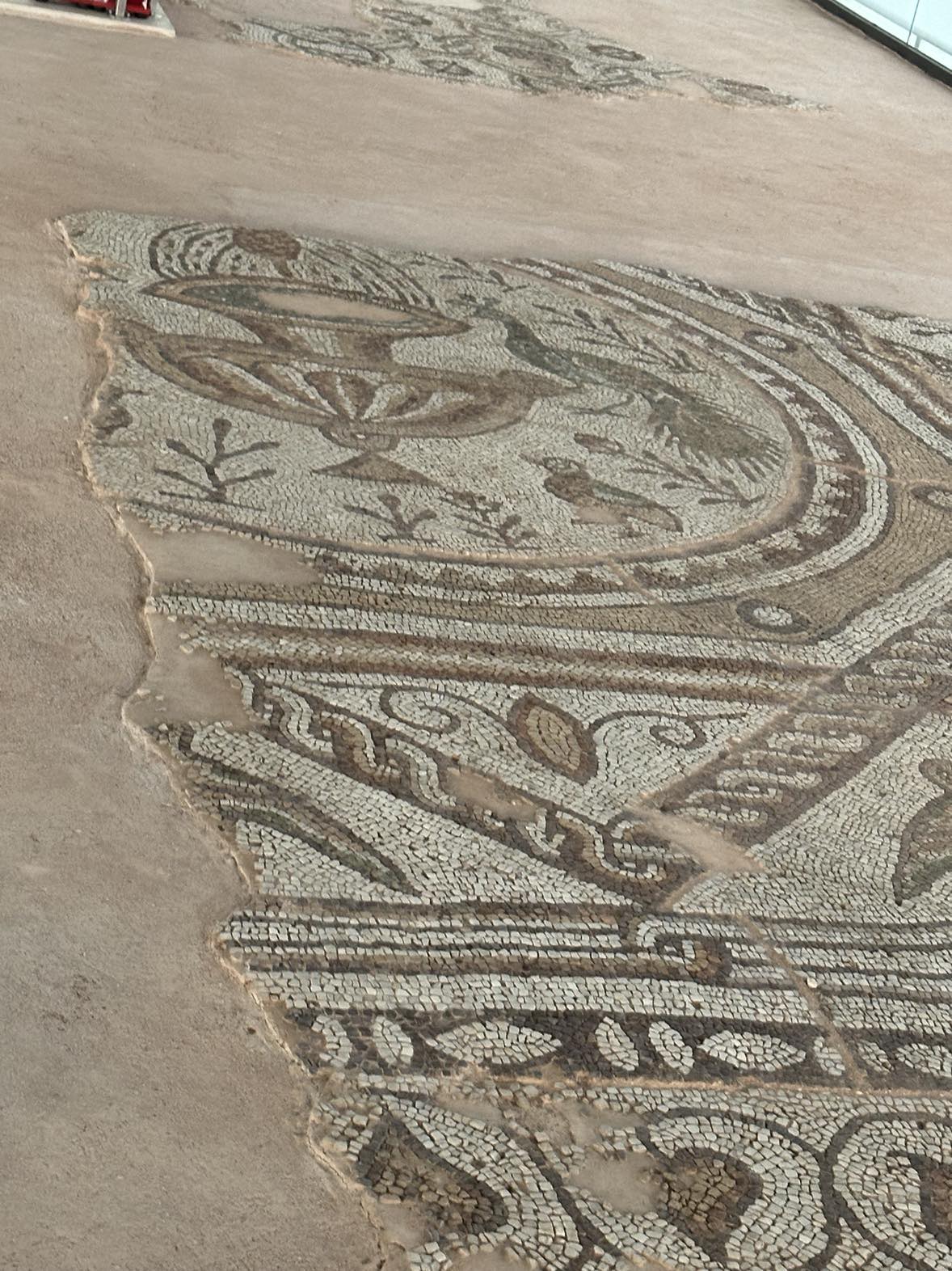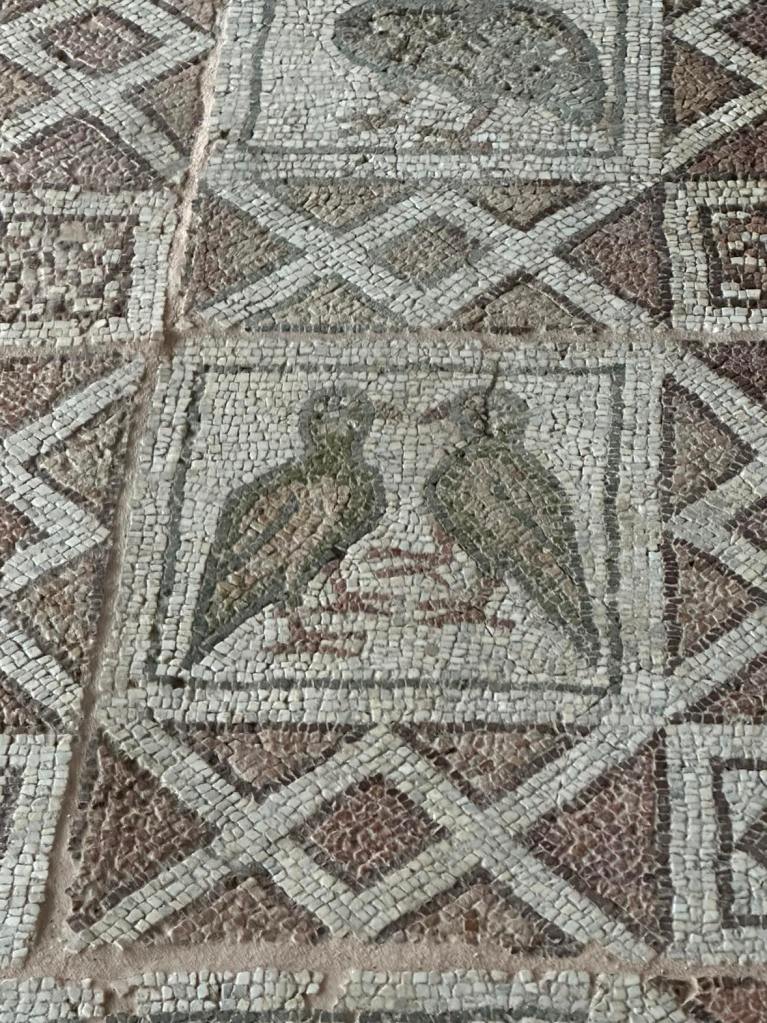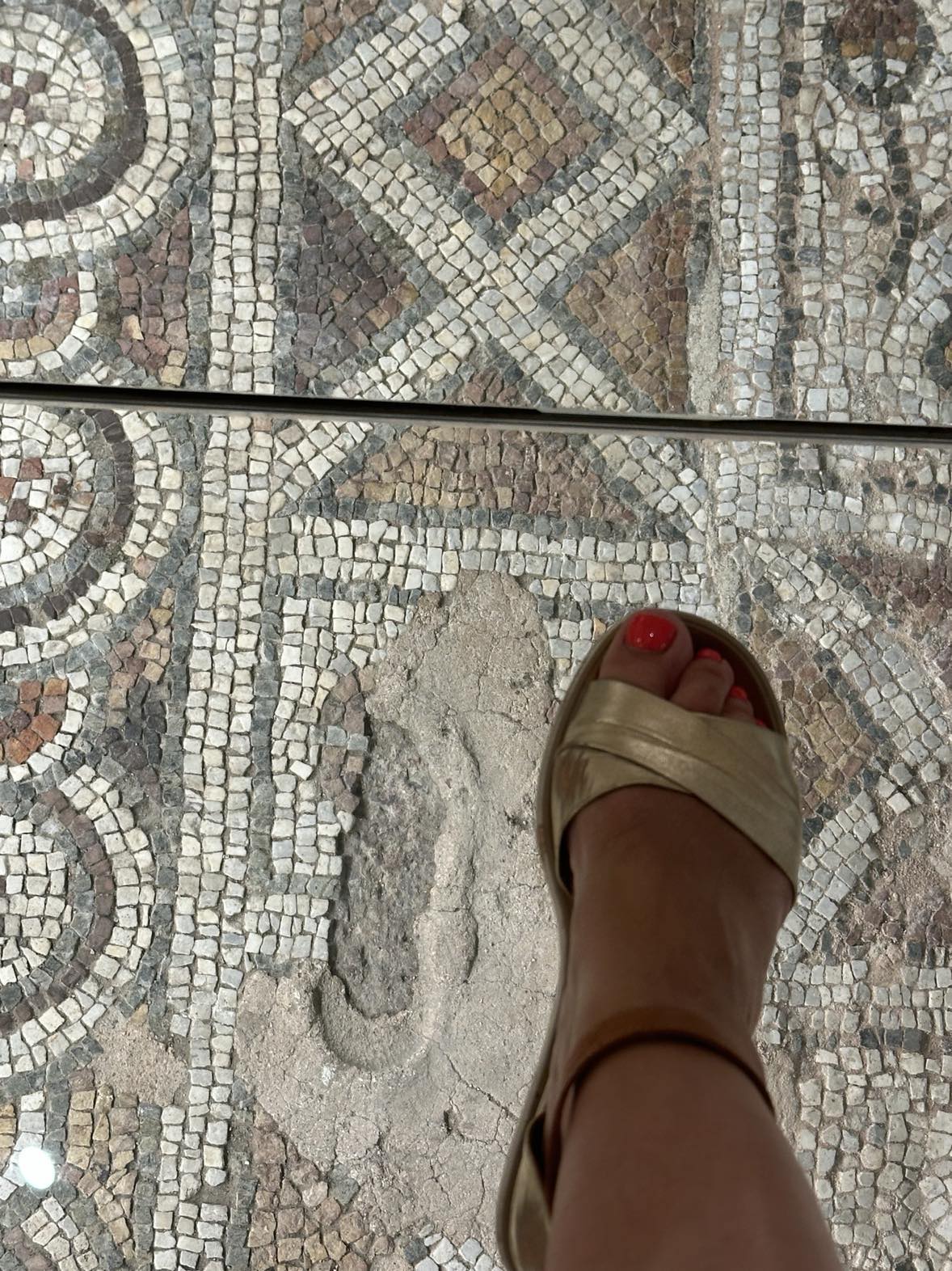 „Виждаш ли ги? Ето тук, в хоросана. На 1700 години са! Носел е моя номер – 42. Премерих. Само че аз съм с маратонки, а той е бил с островърхи чехли с налчета. Това до тях са детски стъпчици. Довел е детенцето си на обекта. Може би е нямало на кого да го остави“, обяснява Митко, реставратор от екипа, който върна живота на мозайките. „Тук са работели всякакви хора. Някои от тях са били чуждестранни експерти, навярно от Тунис или Алжир. Личи си по финия стил. Виж тук вдясно от входа, където е надписът на епископа. Може би той лично е платил за тази част. Гледай колко прецизно е наредена!“