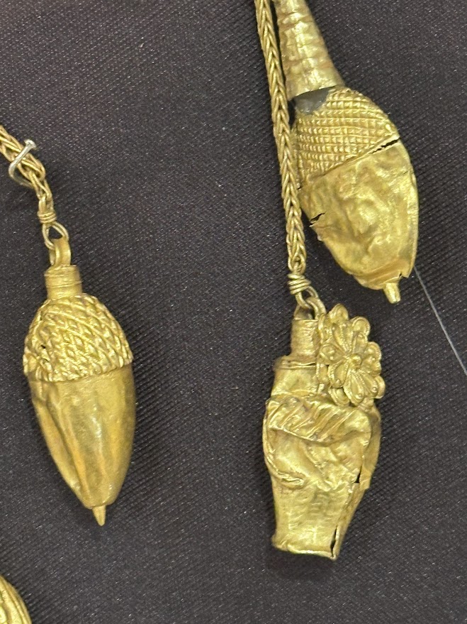 Когато свършил с търкането, Владо поразровил още малко. На два метра встрани намерил части от бронзов съд. А след това и две-три златни полусфери, подобни на капзите по кожените якета. Едва тогава се сетил, че тази работа не е току-тъй и звъннал в музея във Велико Търново. Довтасали археолозите и още в първите дни на разкопките се натъкнали на най-великолепната част от Къпиновското съкровище – златния накит. Бижуто е точно като в песента на Диана Експрес „Богатство“, но не с две праскови и две череши, а с десет жълъда, два бадема и една овнешка глава. От чисто злато. Закачени на сложно изплетена златна верижка с изящна закопчалка. Жълъдите са различни – някои са по-тумбести, други по-издължени. Шарките по шапчиците им също не са фабрично еднакви. Затова археолозите предполагат, че в златарското ателие, някъде по крайбрежието на Егейско море, по бижуто са работили няколко майстори. Навярно човекът, на когото е принадлежал, го е носил закачен за дрехата с фибула. Трудно е да се определи дали бижуто е мъжко или женско. На мястото, където е открито, няма човешки останки.