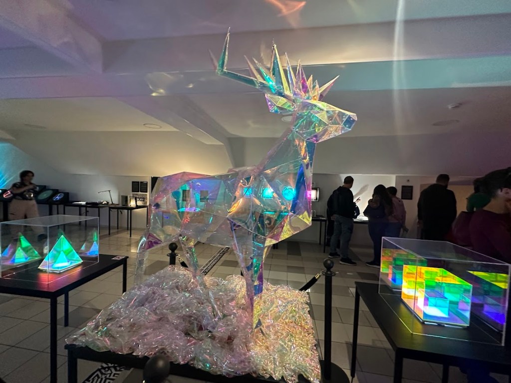 Най-интересни ми бяха три от инсталациите. Едната – защото попада право в центъра между науката и изкуството с творбите на американската художничка Остин Ууд Комароу, изобретател на Polage техниката. Харесва ми, когато художници и скулптори вплитат наука в работите си. Остин използва тънки прозрачни листове целулоид, от които прави колажи, като залепя елементите под различен ъгъл. Когато ги погледнете през поляризационен филтър – подобен на UV защитата на слънчевите ви очила, картините стават цветни. Без нито грам боя. Истинска магия!